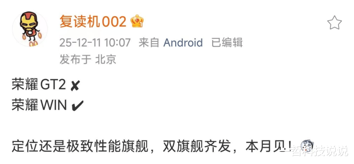 这次"荣耀WIN"系列定位依然是极致性能旗舰,将在本月发布,赶在年货节前上市,这波时间卡得倒是精准。
