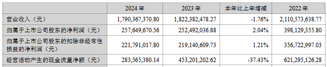 2022年至2024年,公司营业收入分别为21.11亿元、18.22亿元、17.90亿元,归属于上市公司股东的净利润分别为3.98亿元、2.52亿元、2.58亿元,归属于上市公司股东的扣除非经常性损益的净利润分别为3.57亿元、2.19亿元、2.22亿元,经营活动产生的现金流量净额分别为6.21亿元、4.53亿元、2.84亿元。